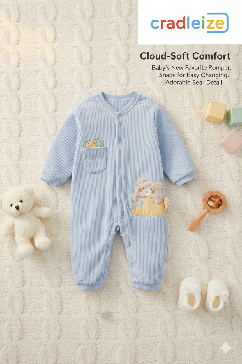 The charming romper in a sky blue hue is an ideal enhancement to the baby's wardrobe.
