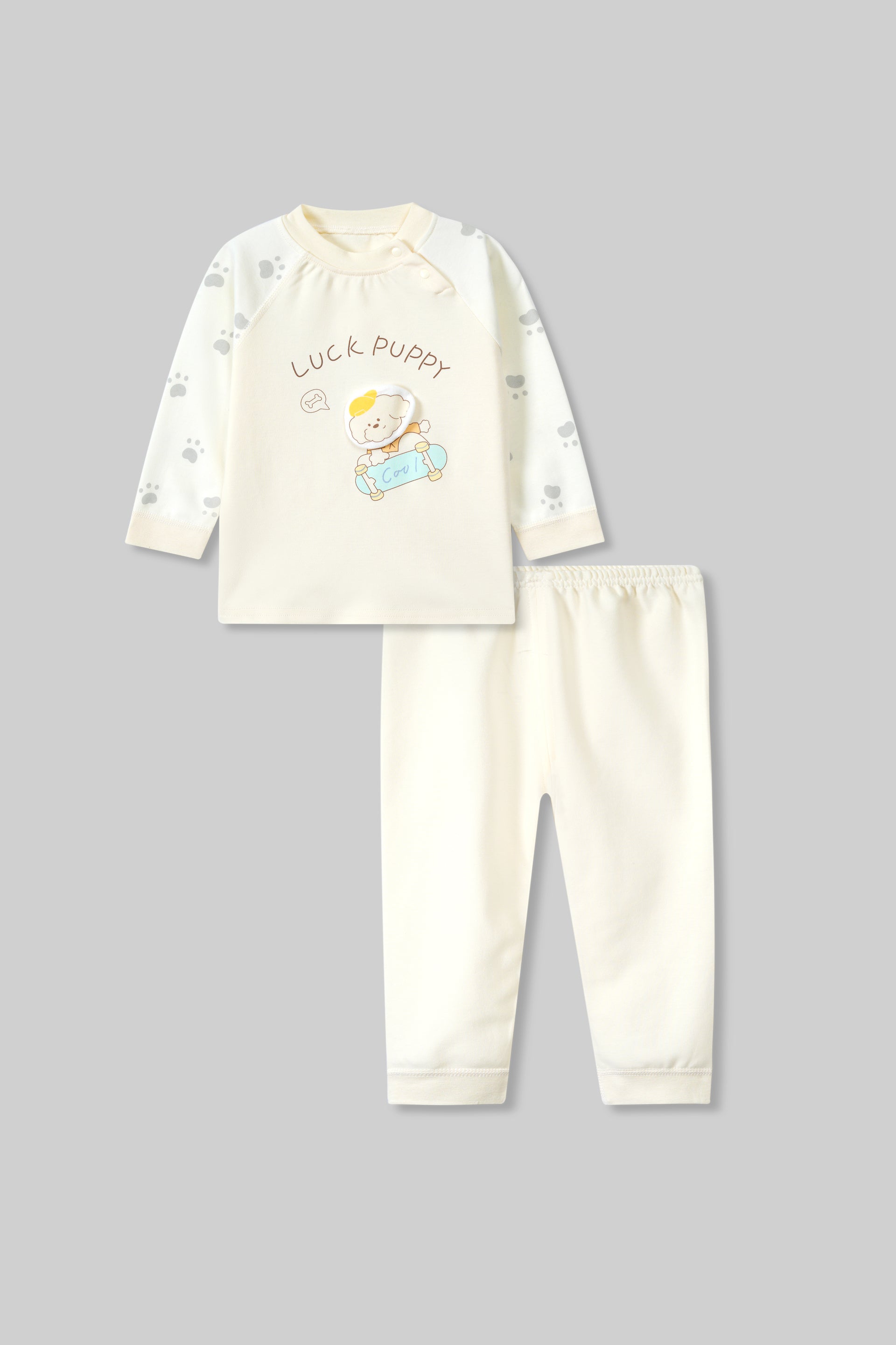 The shirt features a snug fit with gentle stretch, while the trouser comes with an elastic waistband for easy wear.